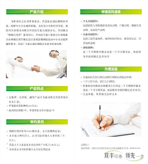 ?????? 为推动礼会信用体系建设,营造依法诚信纳税软环境,缓解中小企业融资难题,支持我市实体经济发展,襄阳市闰家税务局联合中国民生银行襄阳分行,共同推出“纳税信用贷”服务项日,中国民生银行襄阳分行将根据企业纳税信用等级信息以及税款缴纳情况向中小企业提供融资服务,欢迎广大依法诚信纳税企业前来咨询办理。 ?